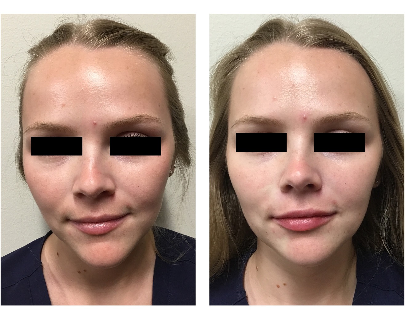 After filler, her cheeks are more contoured, her tear troughs are resolved making her look awake and refreshed. Her lips are full and her jaw is more in proportion to the rest of her face. It should also be noted that one month prior to her filler I also treated her with Botox on her forehead and glabella.